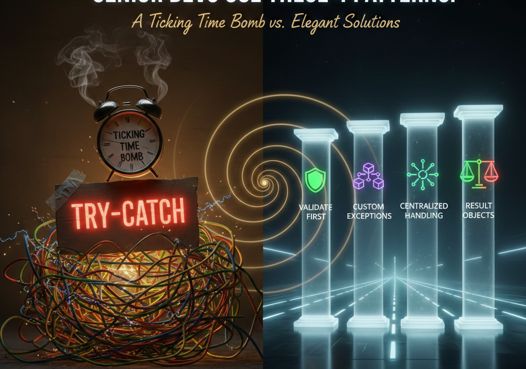 Pengembang Junior Gunakan try-catch Everywhere. Pengembang Senior Menggunakan 4 Pola Penanganan Pengecualian Ini